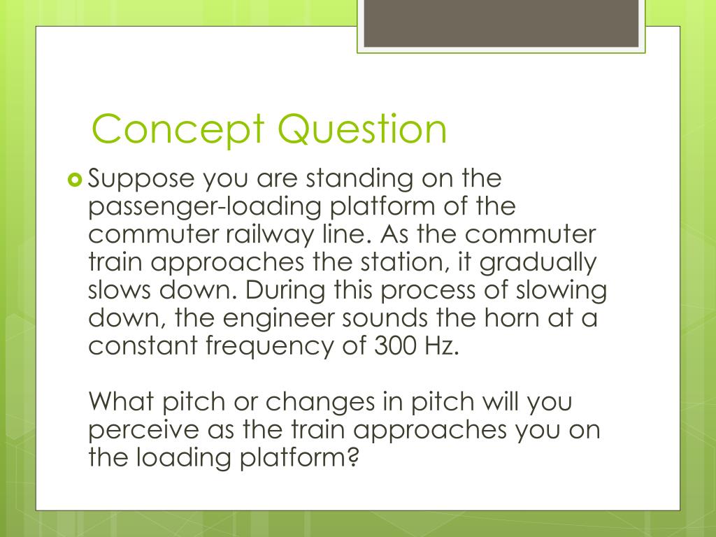 Concept Question • Suppose you are standing on the passenger-loading platform of the commuter railway line. As the commuter train approaches the station, it gradually slows down. During this process of slowing down, the engineer sounds the horn at a constant frequency of 300 Hz. What pitch or changes in pitch will you perceive as the train approaches you on the loading platform?