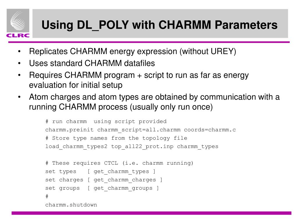 Using DL_POLY with CHARMM Parameters • Replicates CHARMM energy expression (without UREY) • Uses standard CHARMM datafiles • Requires CHARMM program + script to run as far as energy evaluation for initial setup • Atom charges and atom types are obtained by communication with a running CHARMM process (usually only run once) # run charmm using script provided charmm.preinit charmm_script=all.charmm coords=charmm.c # Store type names from the topology file load_charmm_types2 top_all22_prot.inp charmm_types # These requires CTCL (i.e. charmm running) set types [ get_charmm_types ] set charges [ get_charmm_charges ] set groups [ get_charmm_groups ] # charmm.shutdown