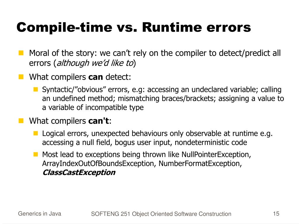 Compile-time vs. Runtime errors • Moral of the story: we can’t rely on the compiler to detect/predict all errors (although we’d like to) • What compilers can detect: • Syntactic/”obvious” errors, e.g: accessing an undeclared variable; calling an undefined method; mismatching braces/brackets; assigning a value to a variable of incompatible type • What compilers can't: • Logical errors, unexpected behaviours only observable at runtime e.g. accessing a null field, bogus user input, nondeterministic code • Most lead to exceptions being thrown like NullPointerException, ArrayIndexOutOfBoundsException, NumberFormatException, ClassCastException SOFTENG 251 Object Oriented Software Construction