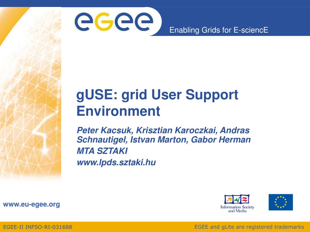 gUSE: grid User Support Environment. Peter Kacsuk, Krisztian Kar o czkai, Andras Schnautigel, Istvan Marton, Gabor Herman MTA SZTAKI www.lpds.sztaki.hu. Content. Motivations Lessons learnt from P - GRADE portal Lessons learnt from accessing production Grid infrastructures