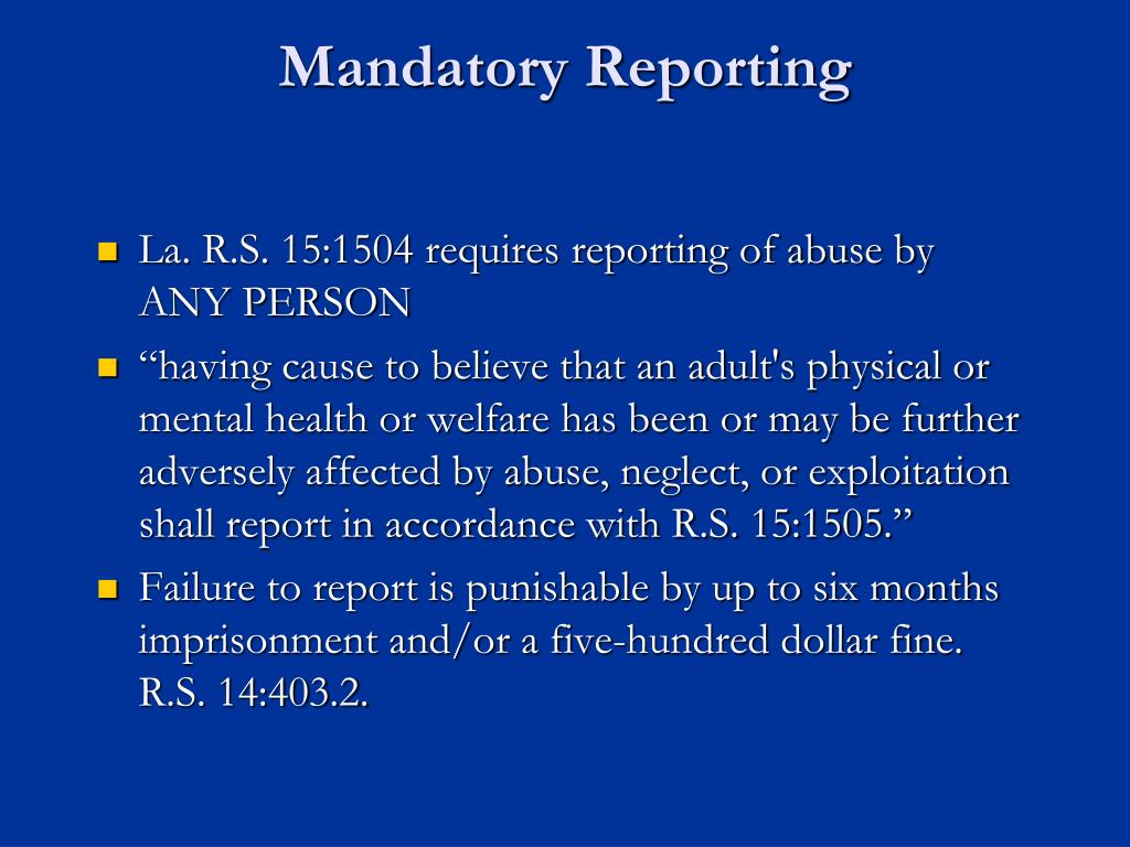 Mandatory Reporting La. R.S. 15:1504 requires reporting of abuse by ANY PERSON “having cause to believe that an adult's physical or mental health or welfare has been or may be further adversely affected by abuse, neglect, or exploitation shall report in accordance with R.S. 15:1505.” Failure to report is punishable by up to six months imprisonment and/or a five-hundred dollar fine. R.S. 14:403.2.