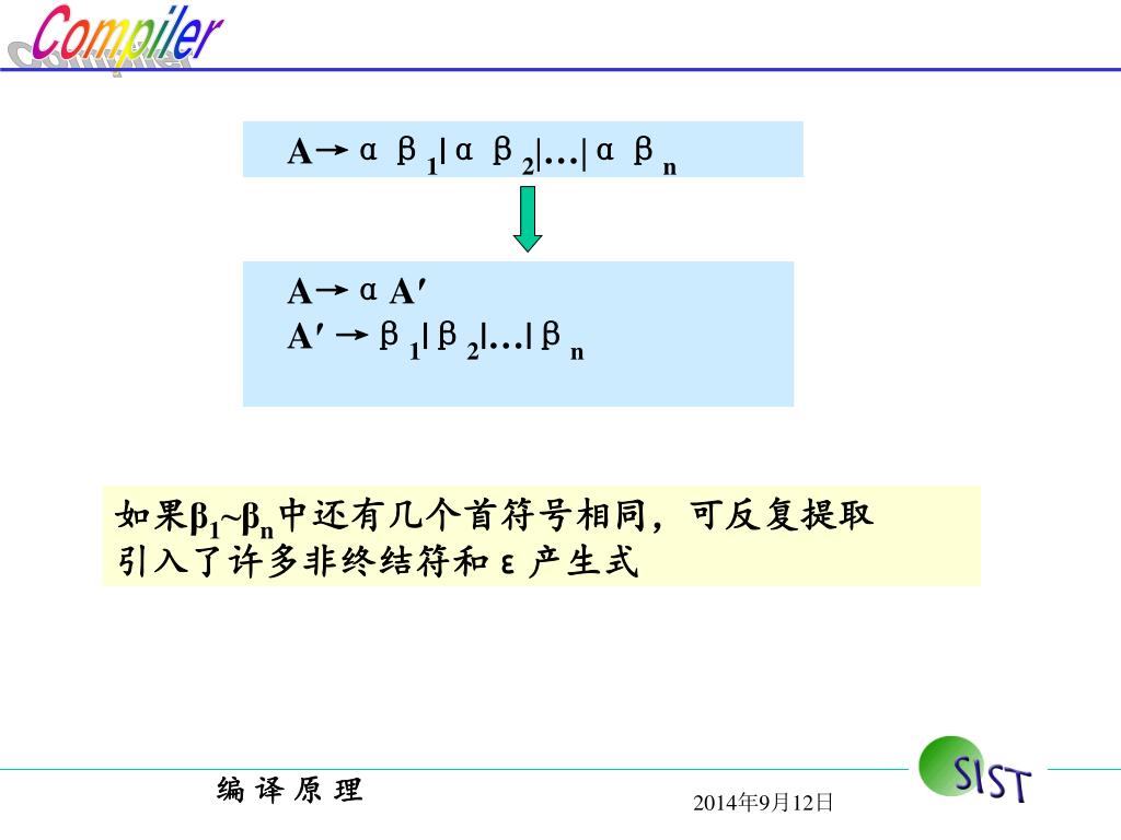 A→αA′ A′ →β1|β2|…|βn A→αβ1|αβ2|…|αβn 如果β1~βn中还有几个首符号相同,可反复提取 引入了许多非终结符和ε产生式