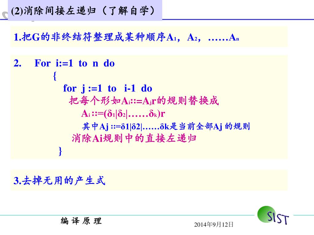 (2)消除间接左递归(了解自学) 1.把G的非终结符整理成某种顺序A1,A2,……An 2. For i:=1 to n do { for j :=1 to i-1 do 把每个形如Ai∷=Ajr的规则替换成 Ai ∷=(δ1|δ2|……δk)r 其中Aj ∷=δ1|δ2|……δk是当前全部Aj 的规则 消除Ai规则中的直接左递归 } 3.去掉无用的产生式