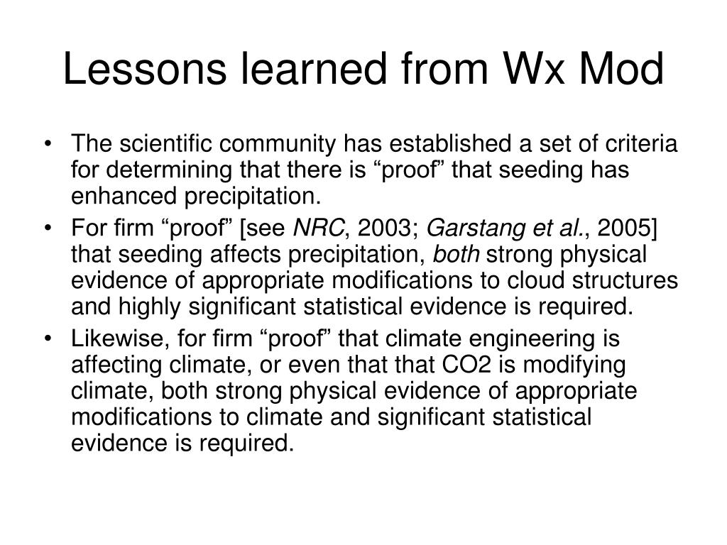 Lessons learned from Wx Mod • The scientific community has established a set of criteria for determining that there is “proof” that seeding has enhanced precipitation. • For firm “proof” [see NRC, 2003; Garstang et al., 2005] that seeding affects precipitation, both strong physical evidence of appropriate modifications to cloud structures and highly significant statistical evidence is required. • Likewise, for firm “proof” that climate engineering is affecting climate, or even that that CO2 is modifying climate, both strong physical evidence of appropriate modifications to climate and significant statistical evidence is required.