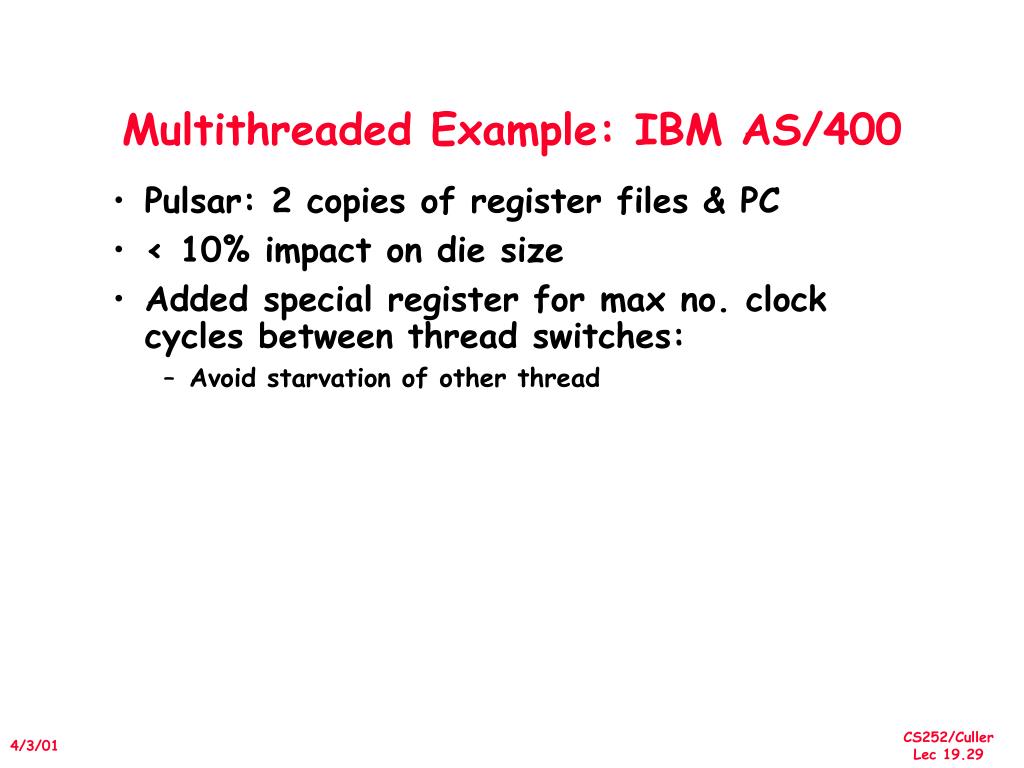Multithreaded Example: IBM AS/400 • Pulsar: 2 copies of register files & PC • < 10% impact on die size • Added special register for max no. clock cycles between thread switches: • Avoid starvation of other thread