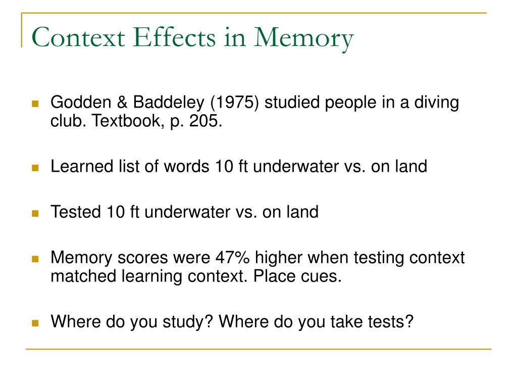 Context Effects in Memory • Godden & Baddeley (1975) studied people in a diving club. Textbook, p. 205. • Learned list of words 10 ft underwater vs. on land • Tested 10 ft underwater vs. on land • Memory scores were 47% higher when testing context matched learning context. Place cues. • Where do you study? Where do you take tests?