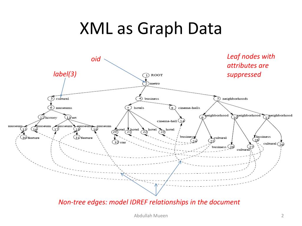 XML as Graph Data Leaf nodes with attributes are suppressed oid label(3) Non-tree edges: model IDREF relationships in the document Abdullah Mueen