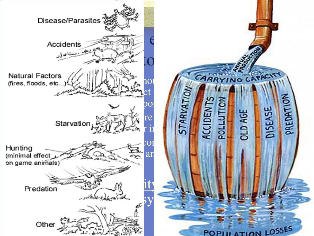 Changes in the environment can also occur due to limiting factors. • Limiting Factors: (amount of food, water, space, shelter, and climate) can affect the number of organisms an environment can support. • Organisms require a certain amount of food, water, space and shelter in order to survive and reproduce. • Organisms will compete for these factors and some will not succeed and die. • Carrying Capacity : the max # of organisms a particular ecosystem can withstand