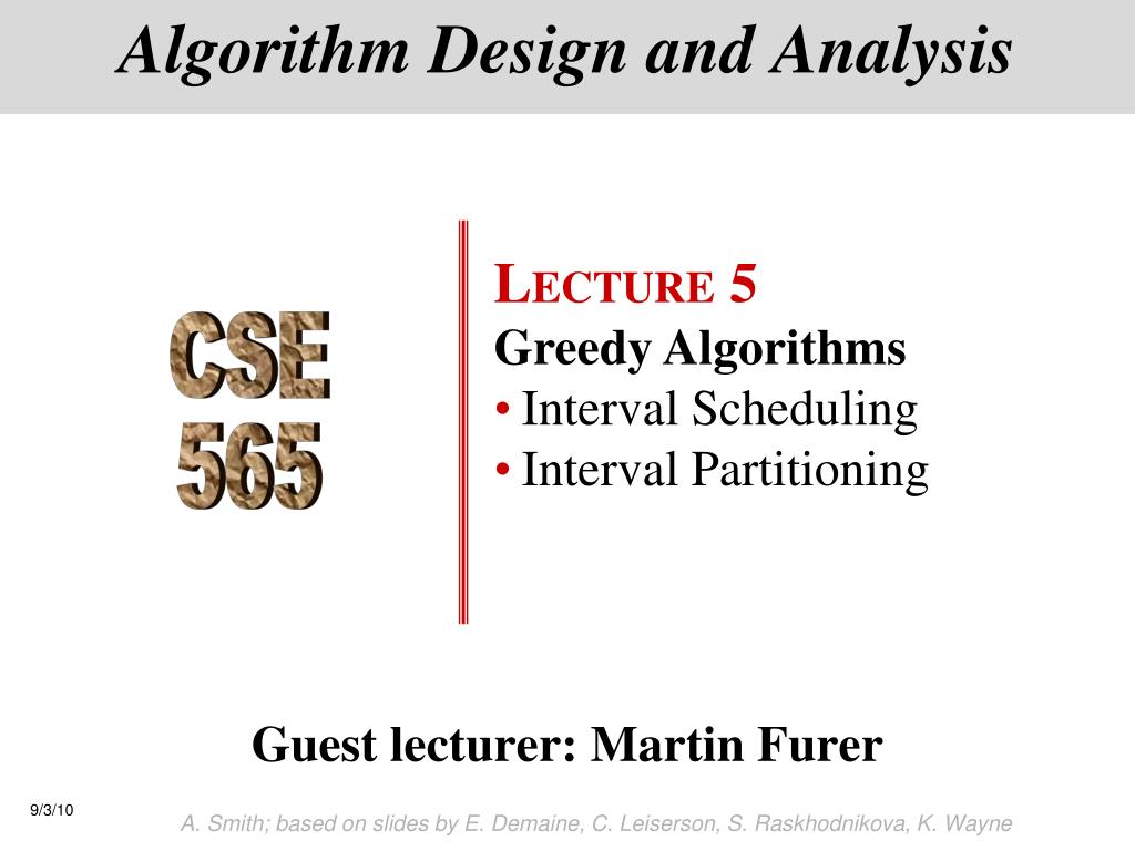 LECTURE 5 • Greedy Algorithms • Interval Scheduling • Interval Partitioning Algorithm Design and Analysis CSE 565 Guest lecturer: Martin Furer A. Smith; based on slides by E. Demaine, C. Leiserson, S. Raskhodnikova, K. Wayne