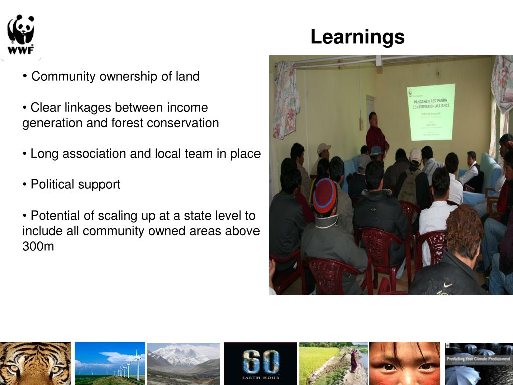 Learnings • Community ownership of land • Clear linkages between income generation and forest conservation • Long association and local team in place • Political support • Potential of scaling up at a state level to include all community owned areas above 300m