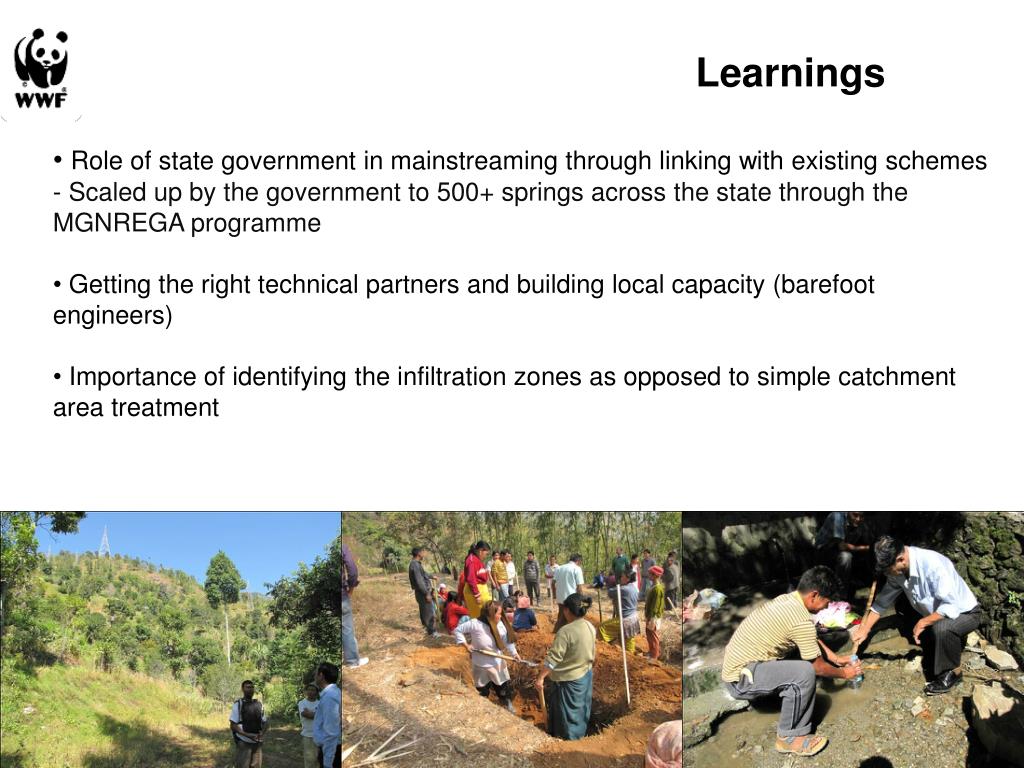 Learnings • Role of state government in mainstreaming through linking with existing schemes - Scaled up by the government to 500+ springs across the state through the MGNREGA programme • Getting the right technical partners and building local capacity (barefoot engineers) • Importance of identifying the infiltration zones as opposed to simple catchment area treatment