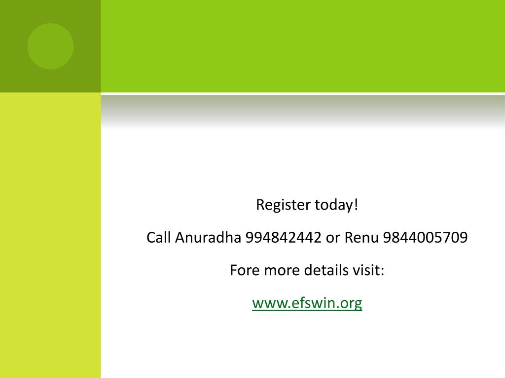 Register today! Call Anuradha 994842442 or Renu 9844005709 Fore more details visit: www.efswin.org