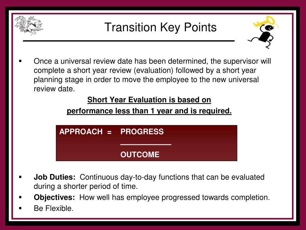 Transition Key Points APPROACH = PROGRESS ____________ OUTCOME Once a universal review date has been determined, the supervisor will complete a short year review (evaluation) followed by a short year planning stage in order to move the employee to the new universal review date. Short Year Evaluation is based on performance less than 1 year and is required. Job Duties: Continuous day-to-day functions that can be evaluated during a shorter period of time. Objectives: How well has employee progressed towards completion. Be Flexible.