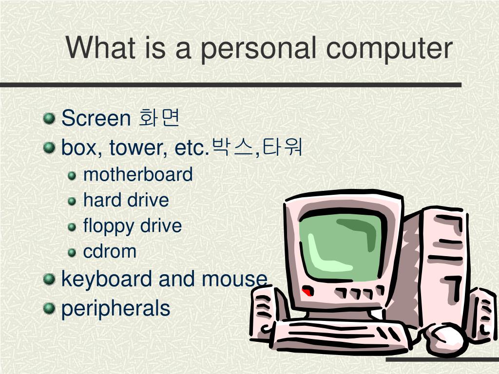 What is a personal computer • Screen 화면 • box, tower, etc.박스,타워 • motherboard • hard drive • floppy drive • cdrom • keyboard and mouse • peripherals