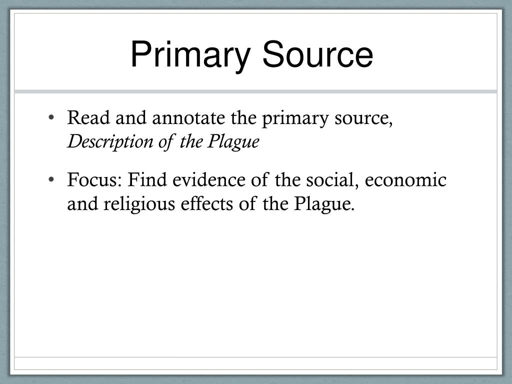 Primary Source • Read and annotate the primary source, Description of the Plague • Focus: Find evidence of the social, economic and religious effects of the Plague.