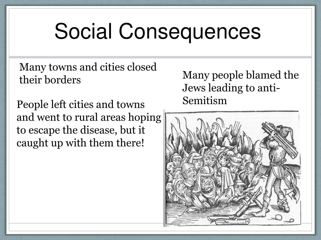 Social Consequences Many towns and cities closed their borders Many people blamed the Jews leading to anti-Semitism People left cities and towns and went to rural areas hoping to escape the disease, but it caught up with them there!