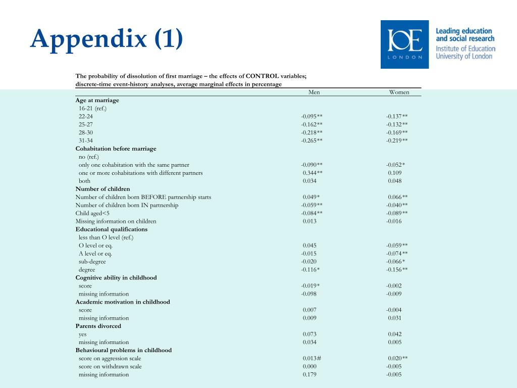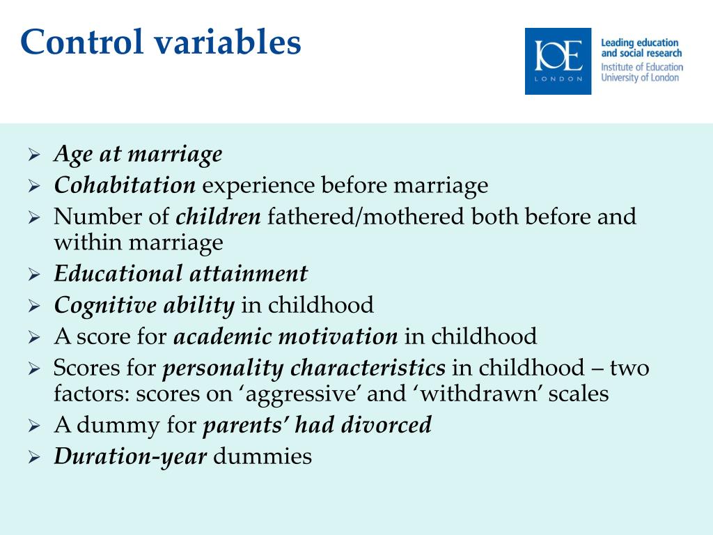 Age at marriage • Cohabitation experience before marriage • Number of children fathered/mothered both before and within marriage • Educational attainment • Cognitive ability in childhood • A score for academic motivation in childhood • Scores for personality characteristics in childhood – two factors: scores on ‘aggressive’ and ‘withdrawn’ scales • A dummy for parents’ had divorced • Duration-year dummies Control variables