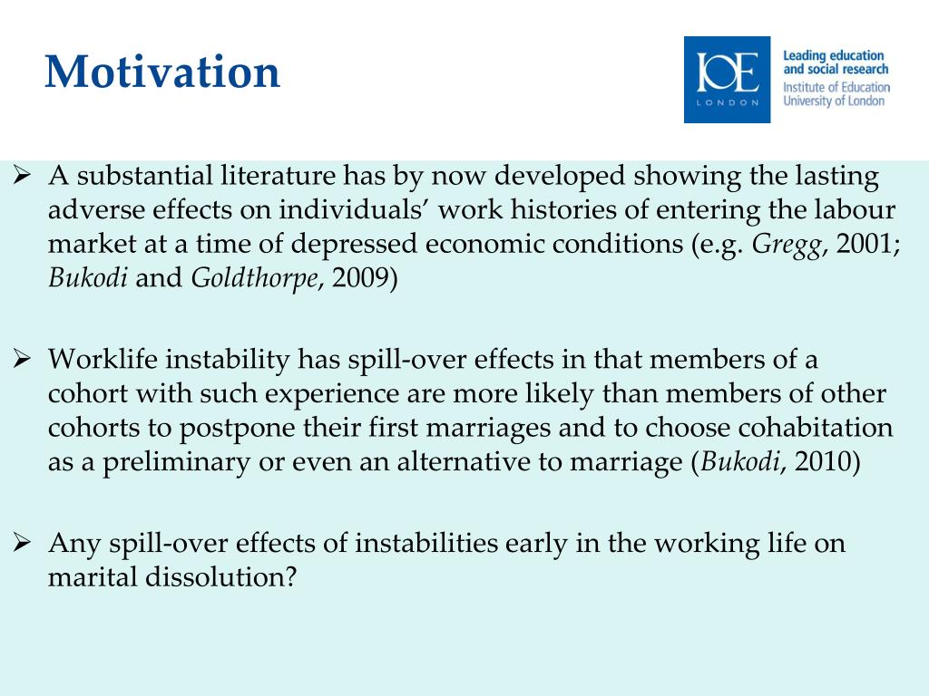Motivation • A substantial literature has by now developed showing the lasting adverse effects on individuals’ work histories of entering the labour market at a time of depressed economic conditions (e.g. Gregg, 2001; Bukodi and Goldthorpe, 2009) • Worklife instability has spill-over effects in that members of a cohort with such experience are more likely than members of other cohorts to postpone their first marriages and to choose cohabitation as a preliminary or even an alternative to marriage (Bukodi, 2010) • Any spill-over effects of instabilities early in the working life on marital dissolution?