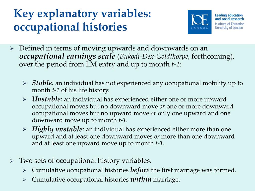 Key explanatory variables: occupational histories • Defined in terms of moving upwards and downwards on an occupational earnings scale (Bukodi-Dex-Goldthorpe, forthcoming), over the period from LM entry and up to month t-1: • Stable:an individual has not experienced any occupational mobility up to month t-1 of his life history. • Unstable:an individual has experienced either one or more upward occupational moves but no downward move or one or more downward occupational moves but no upward move or only one upward and one downward move up to month t-1. • Highly unstable: an individual has experienced either more than one upward and at least one downward moves or more than one downward and at least one upward move up to month t-1. • Two sets of occupational history variables: • Cumulative occupational histories before the first marriage was formed. • Cumulative occupational histories within marriage.
