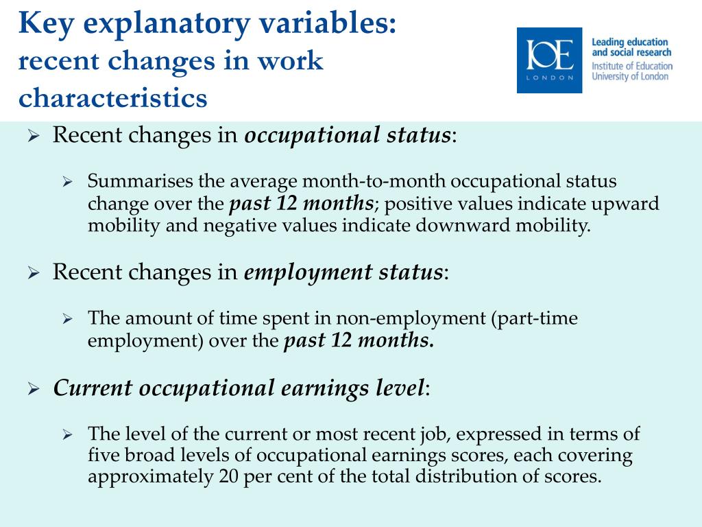 Key explanatory variables: recent changes in work characteristics • Recent changes in occupational status: • Summarises the average month-to-month occupational status change over the past 12 months; positive values indicate upward mobility and negative values indicate downward mobility. • Recent changes in employment status: • The amount of time spent in non-employment (part-time employment) over the past 12 months. • Current occupational earnings level: • The level of the current or most recent job, expressed in terms of five broad levels of occupational earnings scores, each covering approximately 20 per cent of the total distribution of scores.