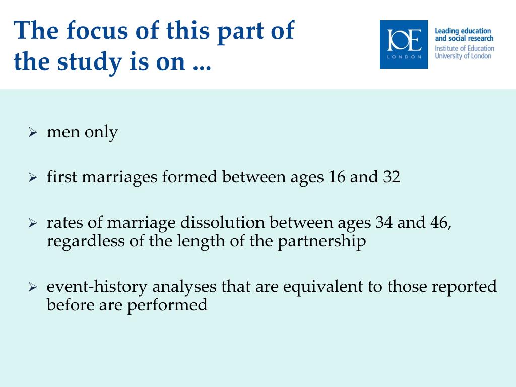 The focus of this part of the study is on ... • men only • first marriages formed between ages 16 and 32 • rates of marriage dissolution between ages 34 and 46, regardless of the length of the partnership • event-history analyses that are equivalent to those reported before are performed