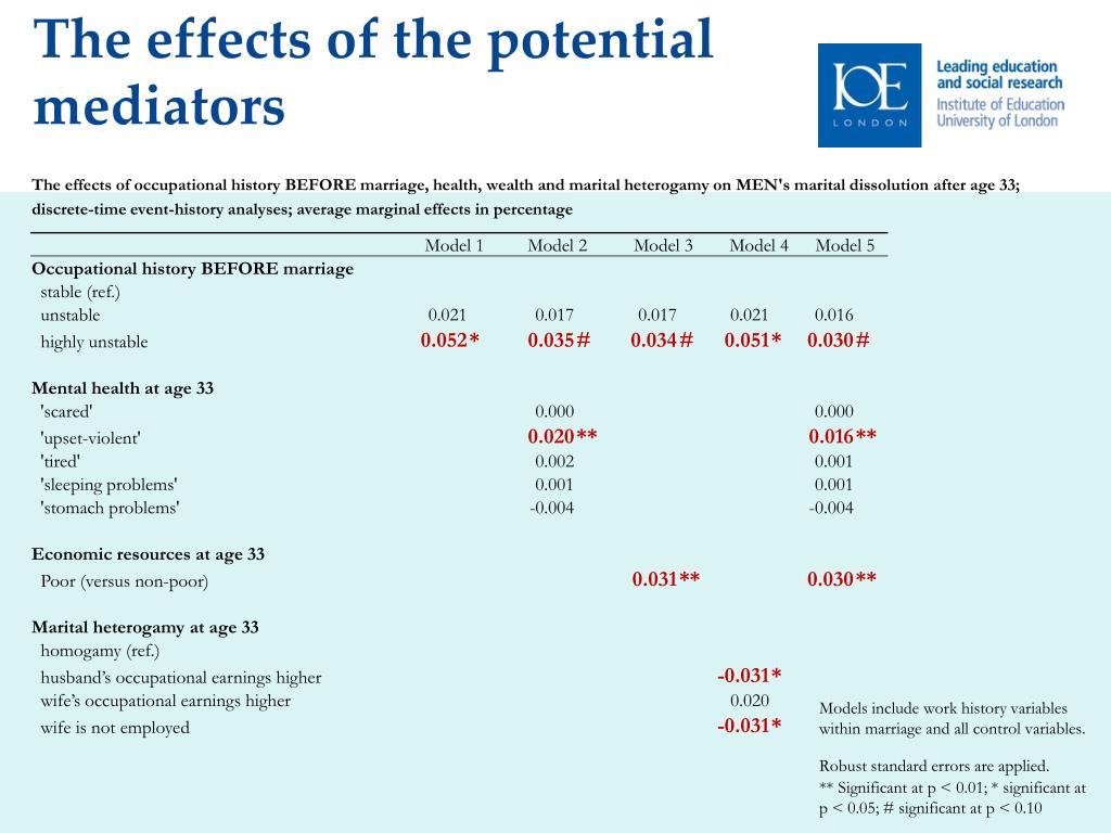 Why are men who experienced volatile occupational careers early in their working lives are more likely to terminate their marriages? • Variables on the three potential mediators come from the age-33 sweep of NCDS: • psychological well-being at age 33: • the Malaise Inventory: 24-item battery of questions designed to identify individuals at high risk of depression • principal component analysis is applied: five components have been extracted • economic resources at age 33: • a 8-point composite index has been constructed using variables on housing conditions and savings/investments • marital heterogamy at age 33: • a three-fold variable has been constructed for capturing different combinations of men’s own and their wives’ occupational earnings