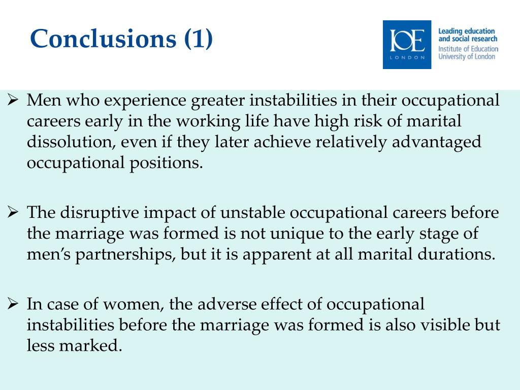 Conclusions (1) • Men who experience greater instabilities in their occupational careers early in the working life have high risk of marital dissolution, even if they later achieve relatively advantaged occupational positions. • The disruptive impact of unstable occupational careers before the marriage was formed is not unique to the early stage of men’s partnerships, but it is apparent at all marital durations. • In case of women, the adverse effect of occupational instabilities before the marriage was formed is also visible but less marked.