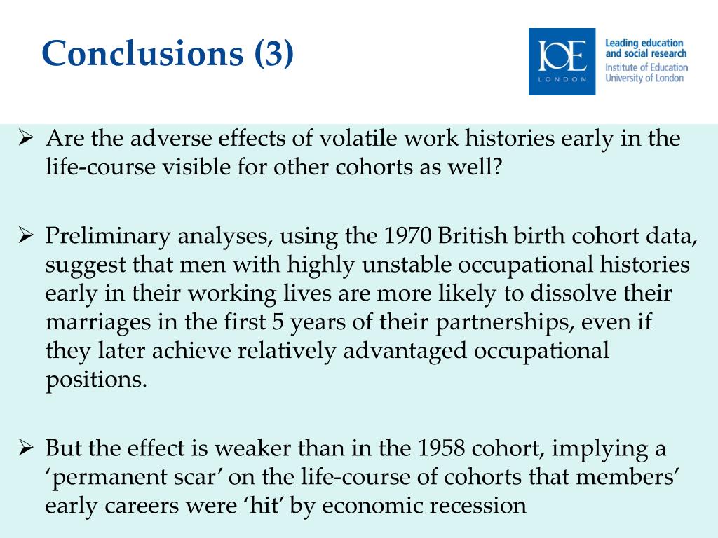 Conclusions (3) • Are the adverse effects of volatile work histories early in the life-course visible for other cohorts as well? • Preliminary analyses, using the 1970 British birth cohort data, suggest that men with highly unstable occupational histories early in their working lives are more likely to dissolve their marriages in the first 5 years of their partnerships, even if they later achieve relatively advantaged occupational positions. • But the effect is weaker than in the 1958 cohort, implying a ‘permanent scar’ on the life-course of cohorts that members’ early careers were ‘hit’ by economic recession