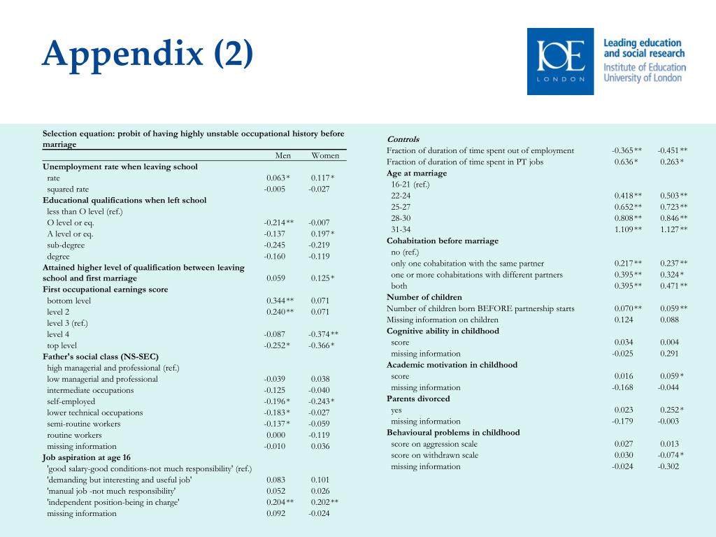 Conclusions (2) • The bias introduced by the selectivity of unstable occupational histories before the marriage was formed has a significant and substantial influence on marital dissolution in case of women, but not for men. • Further analyses indicate that violent and aggressive behaviour in men and men’s failure of accumulating economic resources appear to be the most important factors in explaining why volatile occupational histories early in their working lives are associated with a heightened risk of marital separation.
