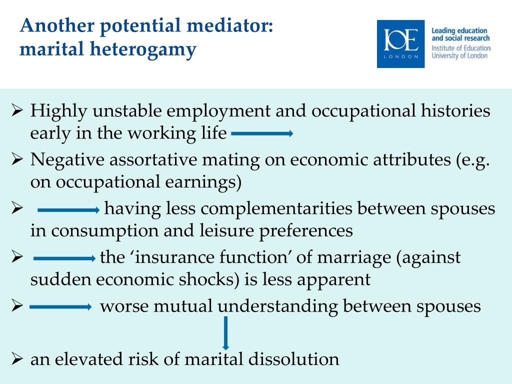 Another potential mediator:marital heterogamy • Highly unstable employment and occupational histories early in the working life • Negative assortative mating on economic attributes (e.g. on occupational earnings) • having less complementarities between spouses in consumption and leisure preferences • the ‘insurance function’ of marriage (against sudden economic shocks) is less apparent • worse mutual understanding between spouses • an elevated risk of marital dissolution