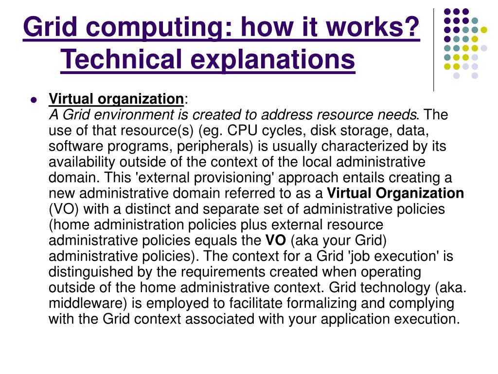 Grid computing: how it works?Technical explanations • Virtual organization:A Grid environment is created to address resource needs. The use of that resource(s) (eg. CPU cycles, disk storage, data, software programs, peripherals) is usually characterized by its availability outside of the context of the local administrative domain. This 'external provisioning' approach entails creating a new administrative domain referred to as a Virtual Organization (VO) with a distinct and separate set of administrative policies (home administration policies plus external resource administrative policies equals the VO (aka your Grid) administrative policies). The context for a Grid 'job execution' is distinguished by the requirements created when operating outside of the home administrative context. Grid technology (aka. middleware) is employed to facilitate formalizing and complying with the Grid context associated with your application execution.