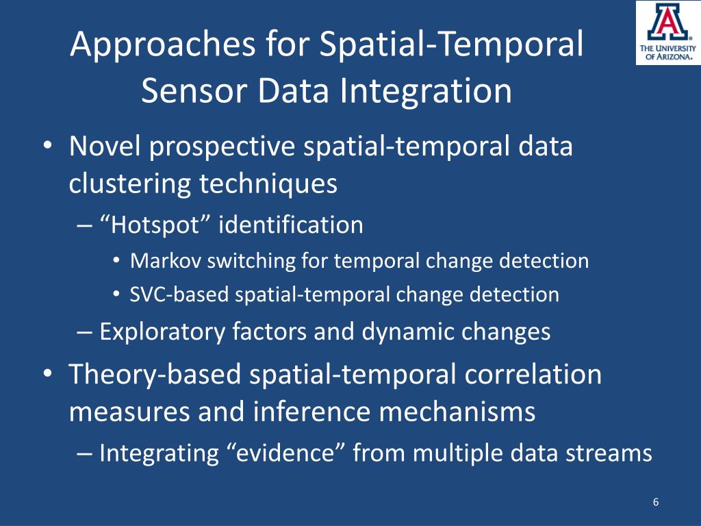 Approaches for Spatial-Temporal Sensor Data Integration • Novel prospective spatial-temporal data clustering techniques • “Hotspot” identification • Markov switching for temporal change detection • SVC-based spatial-temporal change detection • Exploratory factors and dynamic changes • Theory-based spatial-temporal correlation measures and inference mechanisms • Integrating “evidence” from multiple data streams