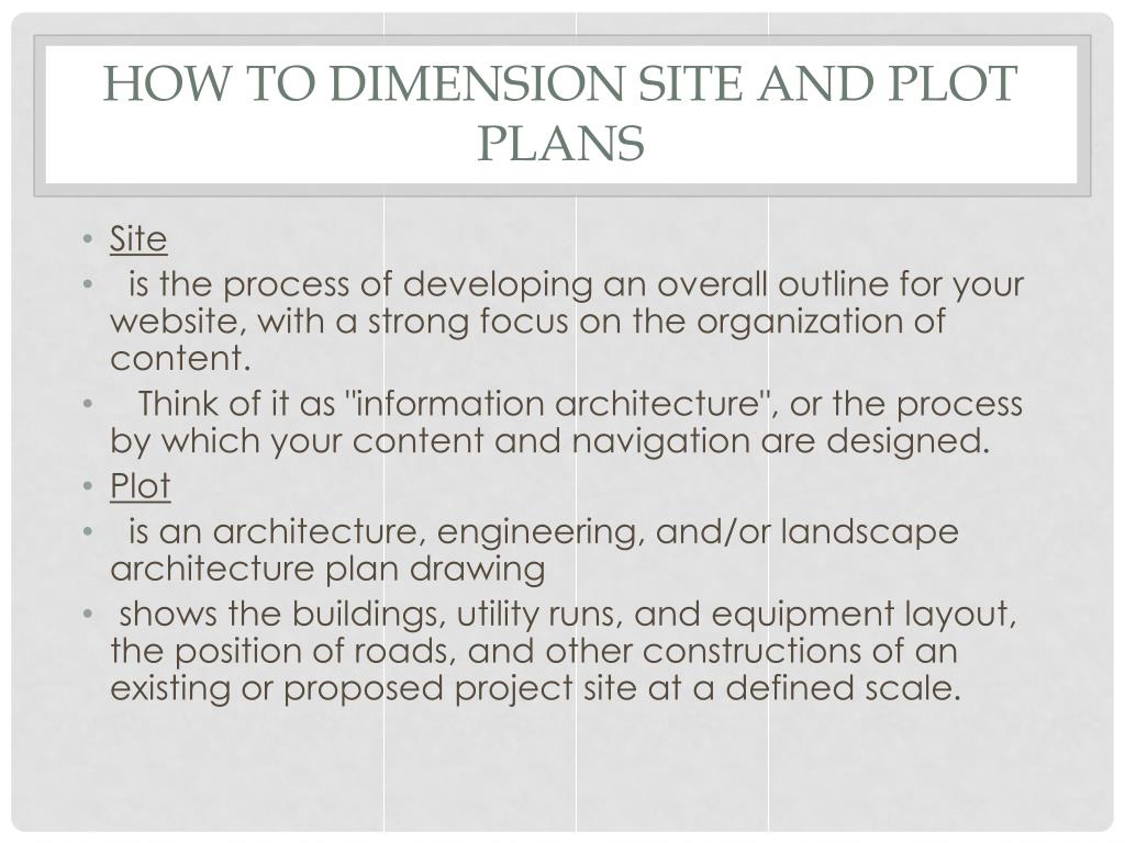 How to dimension site and plot plans • Site • is the process of developing an overall outline for your website, with a strong focus on the organization of content. • Think of it as "information architecture", or the process by which your content and navigation are designed. • Plot • is an architecture, engineering, and/or landscape architecture plan drawing • shows the buildings, utility runs, and equipment layout, the position of roads, and other constructions of an existing or proposed project site at a defined scale.