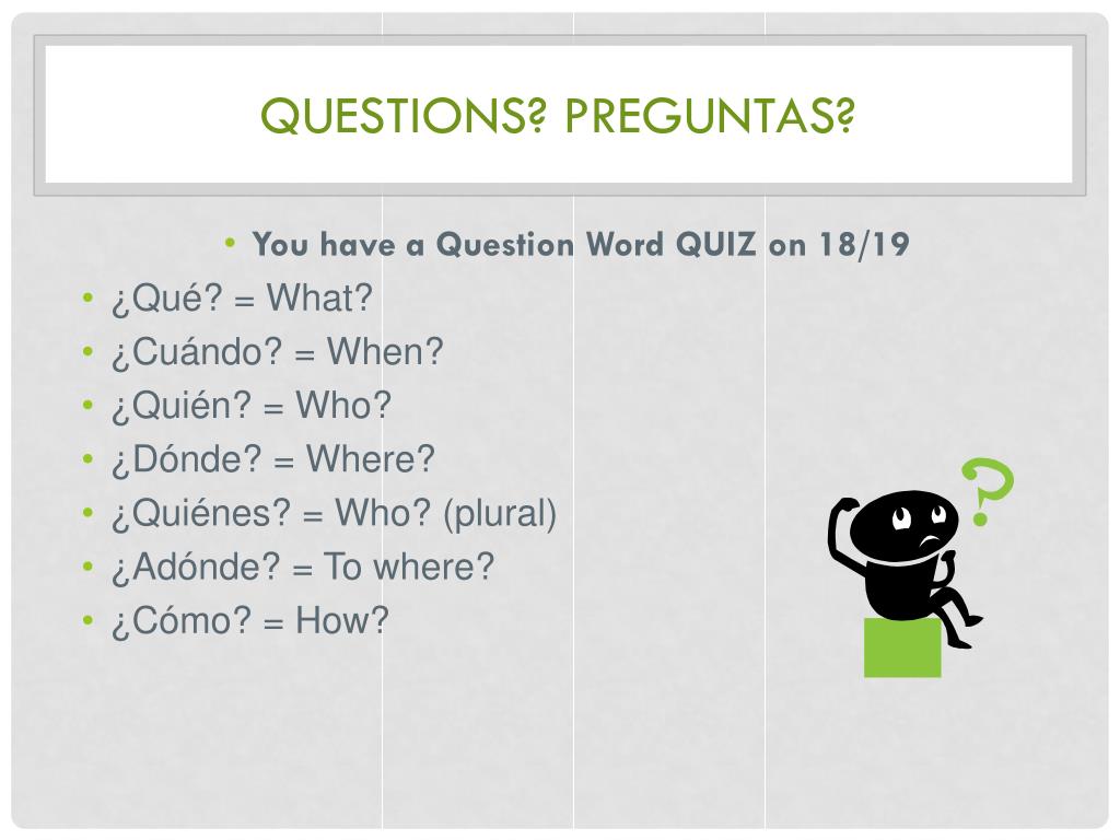 Questions? Preguntas? • You have a Question Word QUIZ on 18/19 • ¿Qué? = What? • ¿Cuándo? = When? • ¿Quién? = Who? • ¿Dónde? = Where? • ¿Quiénes? = Who? (plural) • ¿Adónde? = To where? • ¿Cómo? = How?