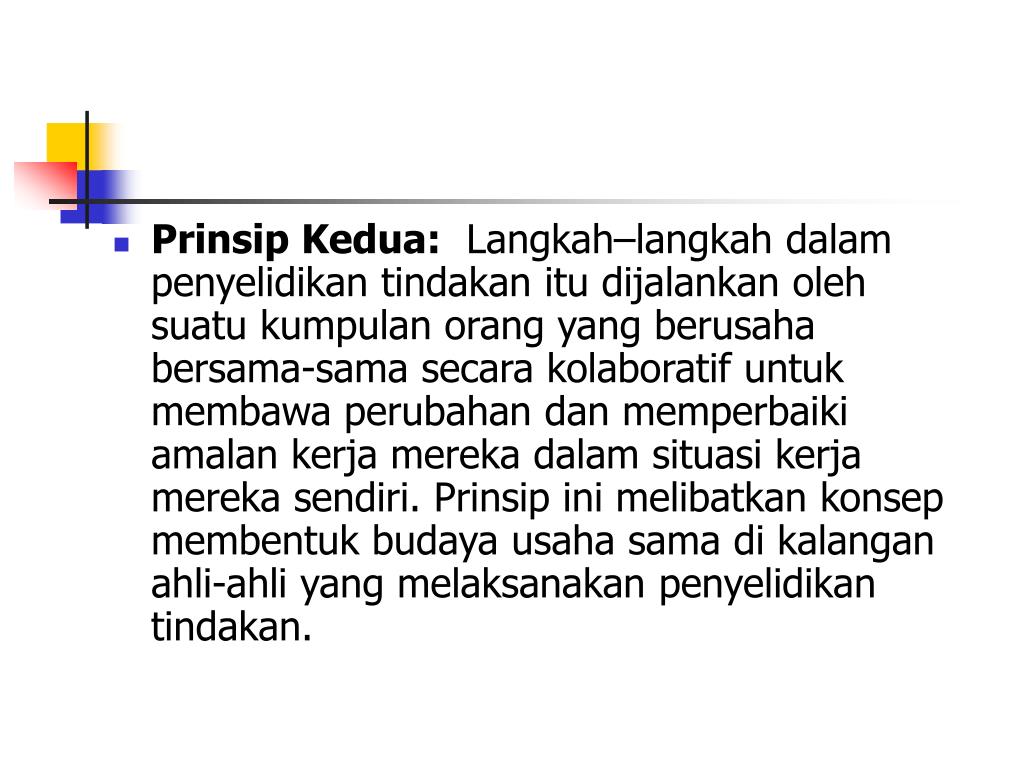 Prinsip Kedua: Langkah–langkah dalam penyelidikan tindakan itu dijalankan oleh suatu kumpulan orang yang berusaha bersama-sama secara kolaboratif untuk membawa perubahan dan memperbaiki amalan kerja mereka dalam situasi kerja mereka sendiri. Prinsip ini melibatkan konsep membentuk budaya usaha sama di kalangan ahli-ahli yang melaksanakan penyelidikan tindakan.