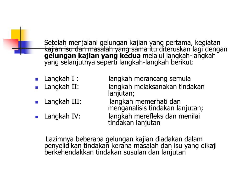Setelah menjalani gelungan kajian yang pertama, kegiatan kajian isu dan masalah yang sama itu diteruskan lagi dengan gelungan kajian yang kedua melalui langkah-langkah yang selanjutnya seperti langkah-langkah berikut: • Langkah I : langkah merancang semula • Langkah II: langkah melaksanakan tindakan lanjutan; • Langkah III: langkah memerhati dan menganalisis tindakan lanjutan; • Langkah IV: langkah merefleks dan menilai tindakan lanjutan Lazimnya beberapa gelungan kajian diadakan dalam penyelidikan tindakan kerana masalah dan isu yang dikaji berkehendakkan tindakan susulan dan lanjutan