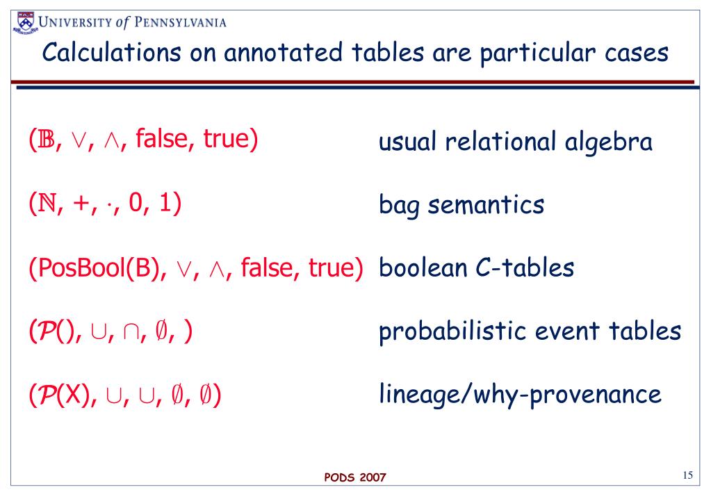 Provenance Semirings • X = {p, r, s, …}: indeterminates (provenance “tokens” for base tuples) • N[X]: multivariate polynomials with coefficients in Nand indeterminates inX • (N[X], +, ¢, 0, 1)is the most “general” commutative semiring: its elements abstract calculations in all semirings • N[X] –relations are the relations with provenance! • The polynomials capture the propagation of provenance through (positive) relational algebra PODS 2007