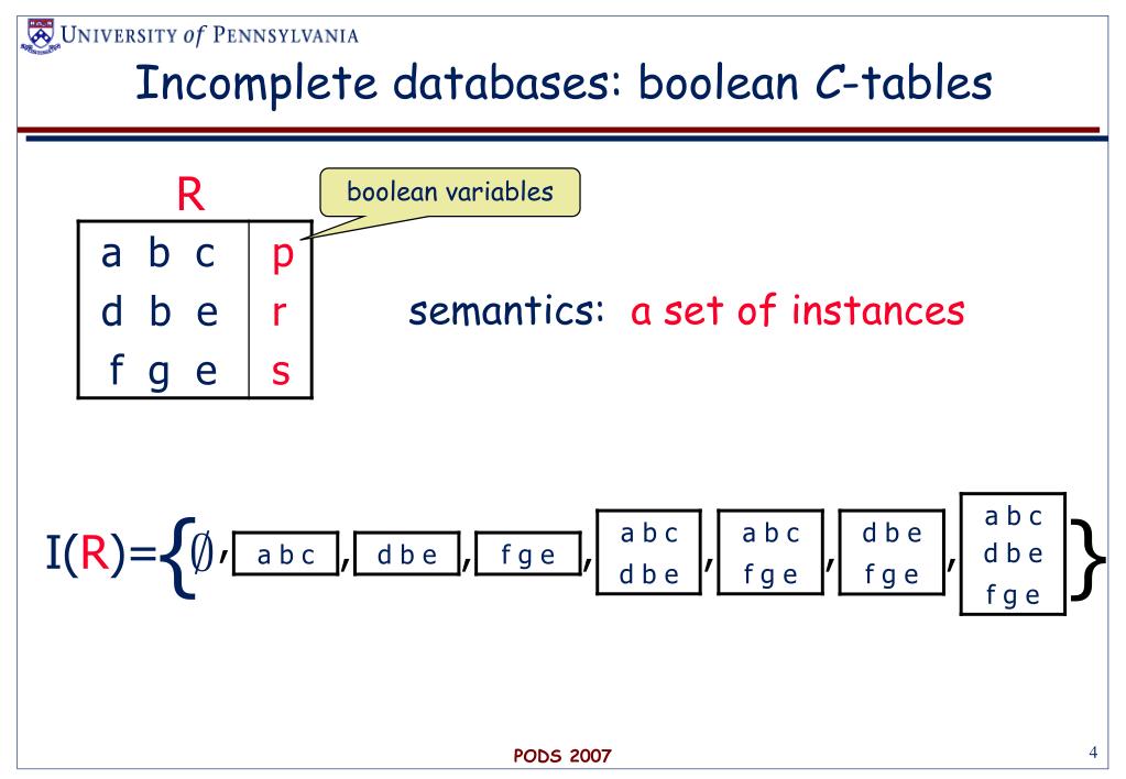 Incomplete databases: boolean C-tables R boolean variables semantics: a set of instances { } , ; I(R)= , , , , , , PODS 2007