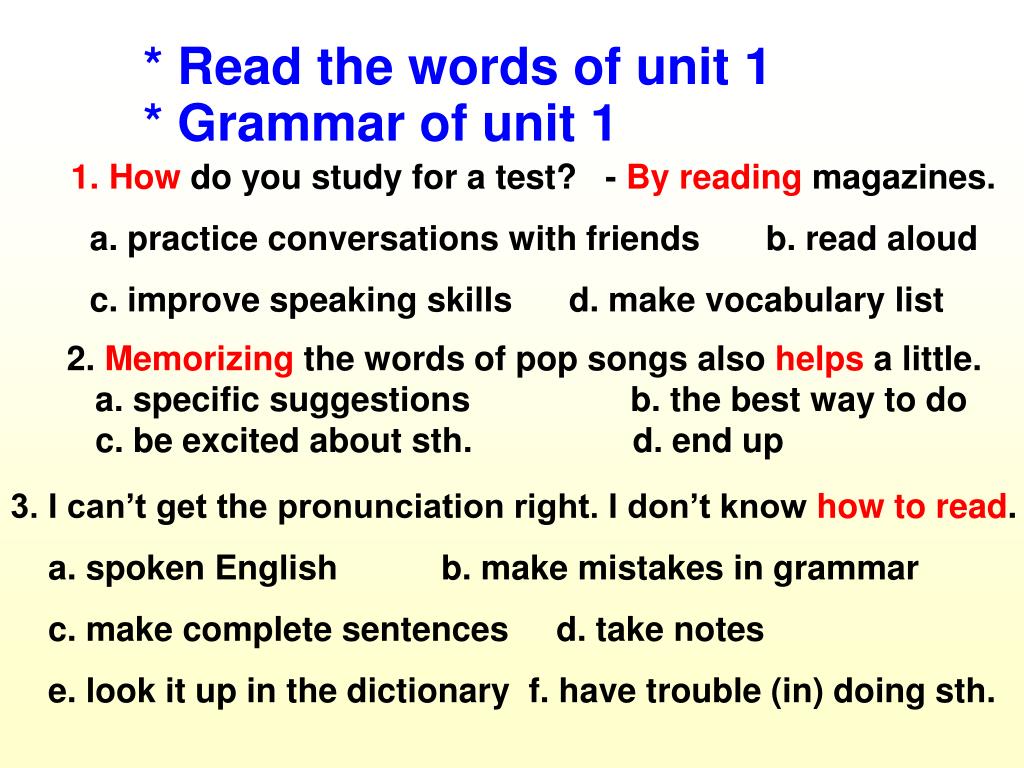 * Read the words of unit 1 * Grammar of unit 1 • How do you study for a test? - By reading magazines. • a. practice conversations with friends b. read aloud • c. improve speaking skills d. make vocabulary list 2. Memorizing the words of pop songs also helps a little. a. specific suggestions b. the best way to do c. be excited about sth. d. end up 3. I can’t get the pronunciation right. I don’t know how to read. a. spoken English b. make mistakes in grammar c. make complete sentences d. take notes e. look it up in the dictionary f. have trouble (in) doing sth.