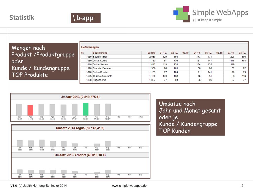 Simple Webapps \ b-app Bestellung Produktionsplan Teiglisten Kommissionierung Lieferung Rechnung Statistik - manuell oder Bestellportal - mit Tourenplänen - Retouren, integrierte Anlage - „Bio“-Nachweise • Controlling • Adressbuch • Skill Management • Einsatzplanung • Zeiterfassung (auch mit Terminal, Datev-Schnittstelle) • Arbeitspläne