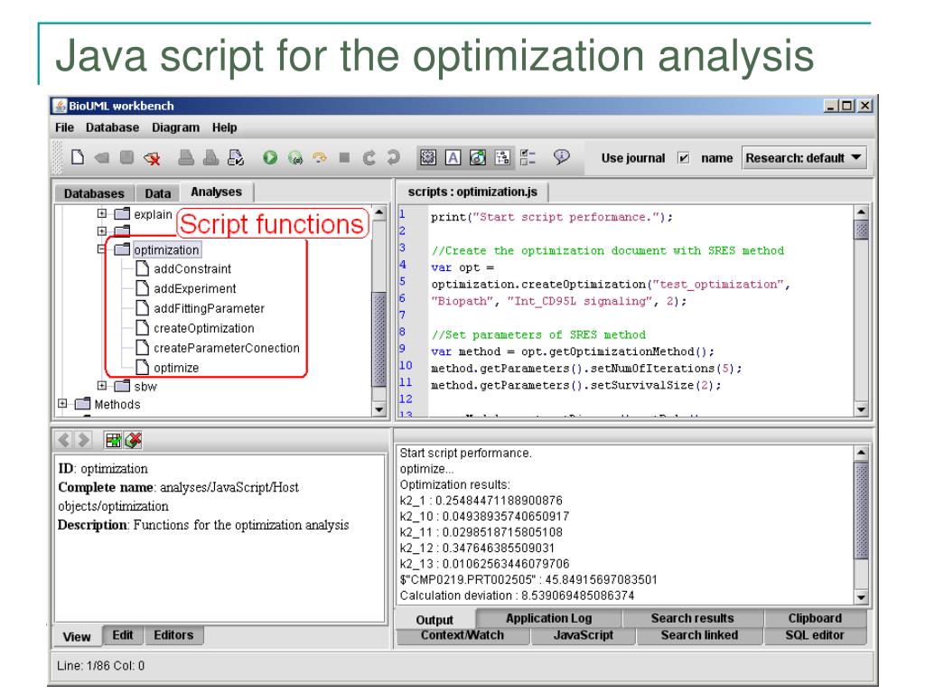 Main features Diagram parameters estimation Experimental data – time courses or steady states expressed as exact or relative values of substance concentrations Different optimization methods for analysis Multi-experiments optimization Constraint optimization Local/global parameters Parameters optimization using java script