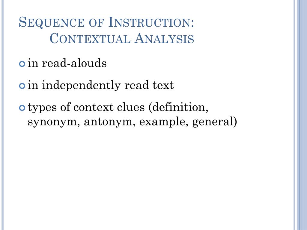 Sequence of Instruction: Contextual Analysis • in read-alouds • in independently read text • types of context clues (definition, synonym, antonym, example, general)