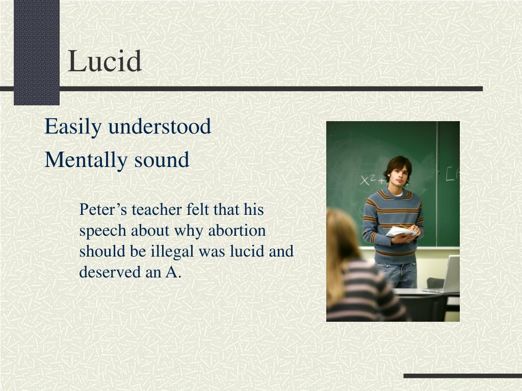 Lucid Easily understood Mentally sound Peter’s teacher felt that his speech about why abortion should be illegal was lucid and deserved an A.