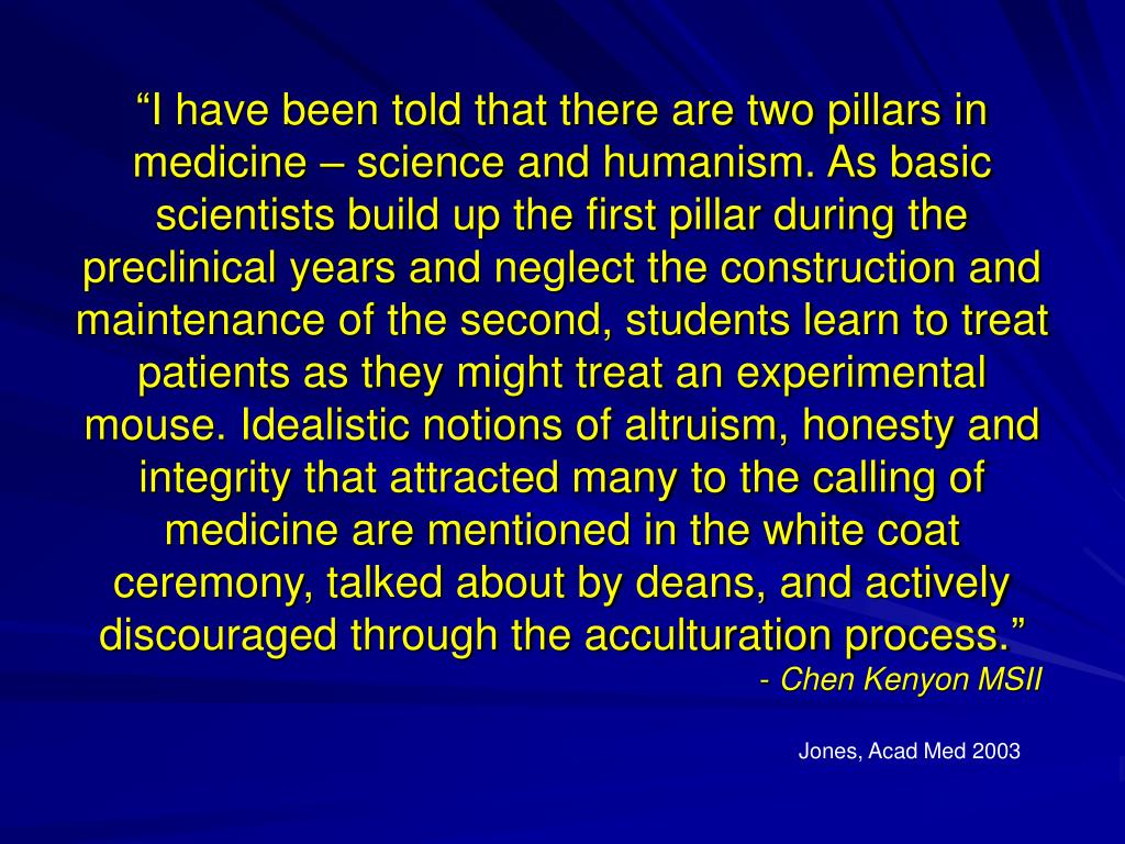 “I have been told that there are two pillars in medicine – science and humanism. As basic scientists build up the first pillar during the preclinical years and neglect the construction and maintenance of the second, students learn to treat patients as they might treat an experimental mouse. Idealistic notions of altruism, honesty and integrity that attracted many to the calling of medicine are mentioned in the white coat ceremony, talked about by deans, and actively discouraged through the acculturation process.” - Chen Kenyon MSII Jones, Acad Med 2003