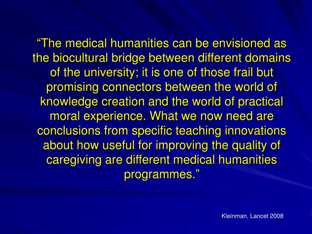 “The medical humanities can be envisioned as the biocultural bridge between different domains of the university; it is one of those frail but promising connectors between the world of knowledge creation and the world of practical moral experience. What we now need are conclusions from specific teaching innovations about how useful for improving the quality of caregiving are different medical humanities programmes.” Kleinman, Lancet 2008