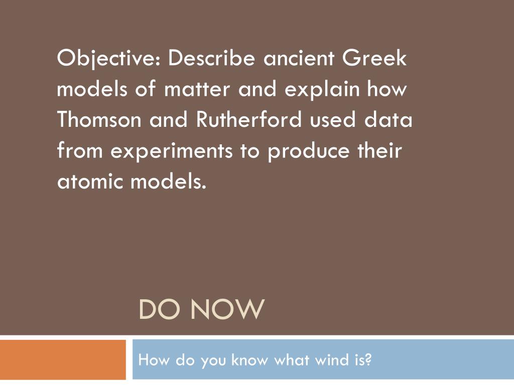 Objective: Describe ancient Greek models of matter and explain how Thomson and Rutherford used data from experiments to produce their atomic models. . DO NOW . How do you know what wind is? . How do you know what the wind is?. Even though you can not see the wind, you know it is there.