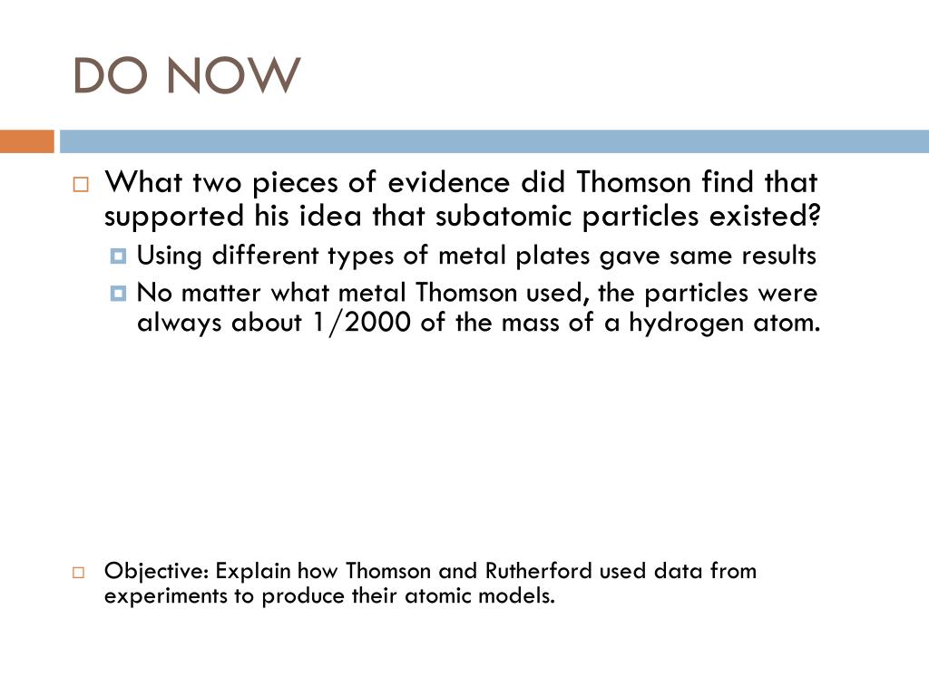 DO NOW • What two pieces of evidence did Thomson find that supported his idea that subatomic particles existed? • Using different types of metal plates gave same results • No matter what metal Thomson used, the particles were always about 1/2000 of the mass of a hydrogen atom. • Objective: Explain how Thomson and Rutherford used data from experiments to produce their atomic models.