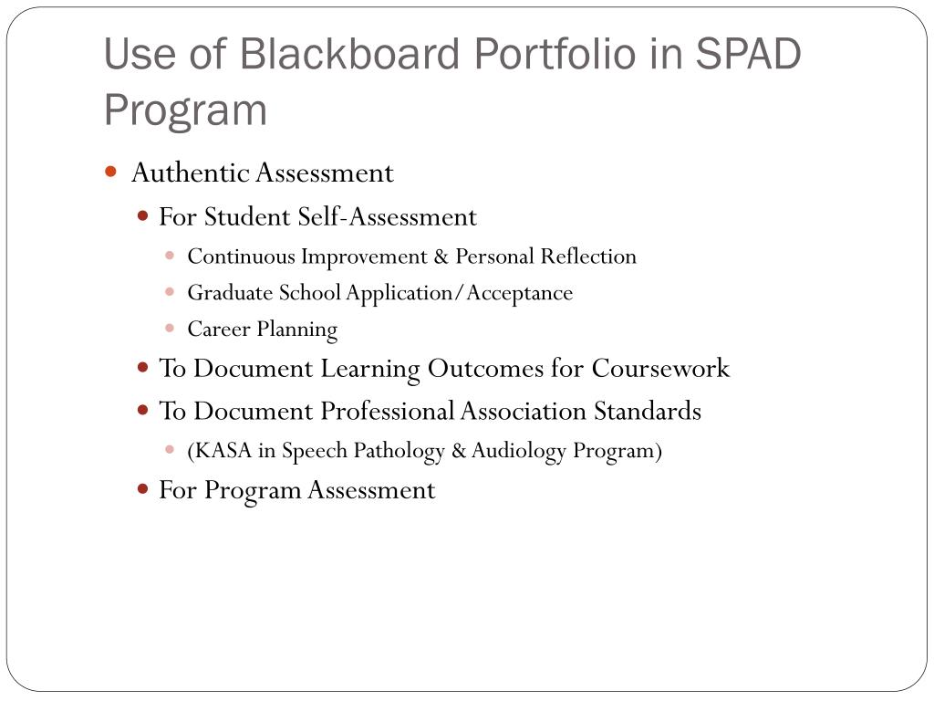 Use of Blackboard Portfolio in SPAD Program • Authentic Assessment • For Student Self-Assessment • Continuous Improvement & Personal Reflection • Graduate School Application/Acceptance • Career Planning • To Document Learning Outcomes for Coursework • To Document Professional Association Standards • (KASA in Speech Pathology & Audiology Program) • For Program Assessment