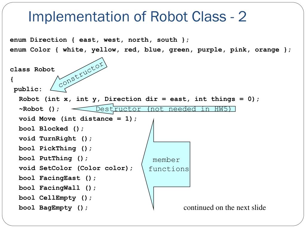 Implementation of Robot Class - 2 constructor enum Direction { east, west, north, south }; enum Color { white, yellow, red, blue, green, purple, pink, orange }; class Robot { public: Robot (int x, int y, Direction dir = east, int things = 0); ~Robot (); void Move (int distance = 1); bool Blocked (); void TurnRight (); bool PickThing (); bool PutThing (); void SetColor (Color color); bool FacingEast (); bool FacingWall (); bool CellEmpty (); bool BagEmpty (); Destructor (not needed in HW5) member functions continued on the next slide