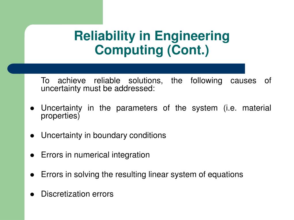Reliability in EngineeringComputing (Cont.) To achieve reliable solutions, the following causes of uncertainty must be addressed: • Uncertainty in the parameters of the system (i.e. material properties) • Uncertainty in boundary conditions • Errors in numerical integration • Errors in solving the resulting linear system of equations • Discretization errors